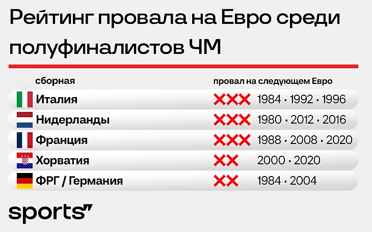 19 из 33 европейских команд, доходивших на чемпионатах мира до полуфиналов (без учета Франции и Хорватии), провалились на следующем Евро − или вообще на него не попали. Будет ли после Евро-2024 пополнение?