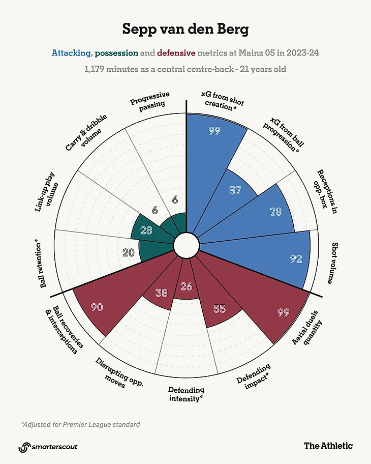 По данным сайта Fbref, точность паса ван ден Берга составила 81% — звучит солидно, но по этому показателю он находится в нижней пятой части списка центральных защитников в пяти крупнейших европейских лигах. Повлияли и типы пасов, которые ему предлагали разыгрывать — как среднего центрального защитника в обороне, его не просили быть игроком, который продвигает мяч.