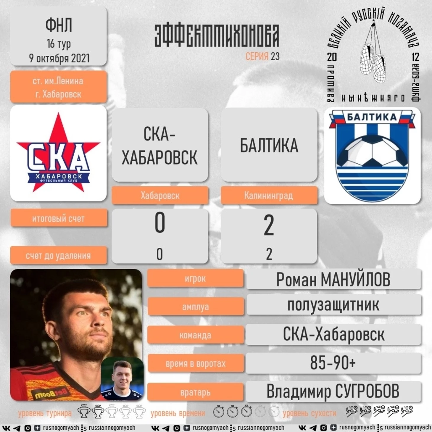 Пример положительного эффекта Тихонова - Роман Мануйлов смог за то время, что «отвел» ему Владимир Сугробов заменить себя в воротах, сохранить эти ворота целыми. Но это не спасло хозяев, которые к моменту удаления вратаря уже проигрывали балтийцам.
