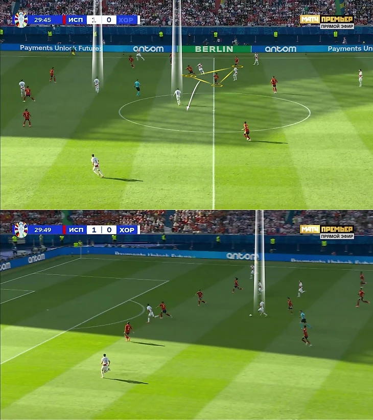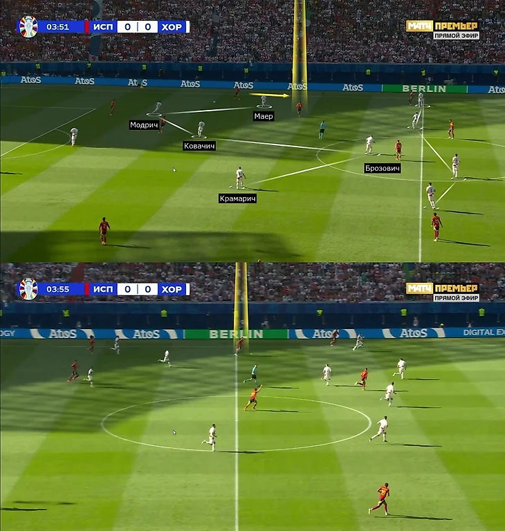 1. Перед голом Мораты Хорватия дважды вскрыла центр поля Испании. Обе атаки не привели ни к чему опасному, но команду аналогично возили и дальше.