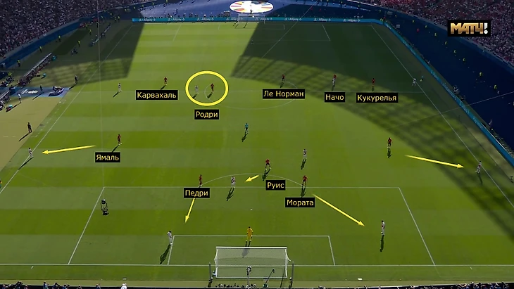 Перед розыгрышами от Доминика Ливаковича испанцы плотно разбирали соперника: вингеры Ламин Ямаль и Нико Уильямс играли по крайним защитникам, Педри поднимался на одну линию к Альваро Морате, чтобы давить центральных и мешать Марцело Брозовичу, а Фабиан Руис обычно шел за Лукой Модричем.