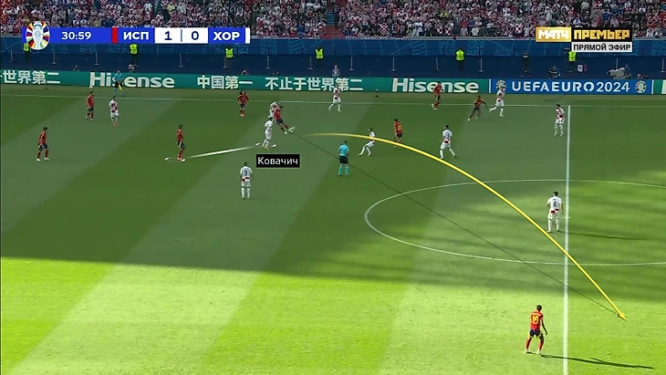 Хорватия с трудом выходила через левый край: Испания все перекрывала или принуждала к длинным забросам, которые тоже помогал чистить Родри.
