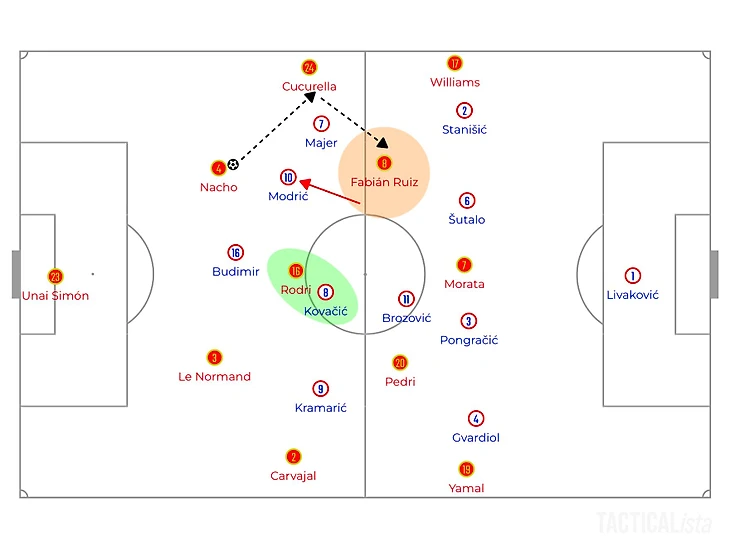 Неплохой план, но идею портили выдергивания Модрича к Начо, из-за этого Ловро Маер разрывался между необходимостью накрывать Кукурелью и ориентироваться на Руиса. Становилось еще сложнее, когда Брозович и Ковичич зависали в стороне Родри и Педри.