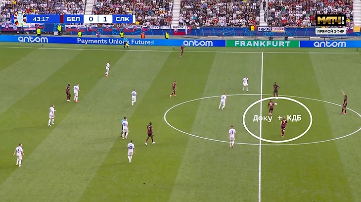 Против Словакии манера Онаны и Мангаля сработала против бельгийцев. Не провалились с точки зрения точности передач, но точно тормозили развитие атаки. Показательный момент перед перерывом, когда к ним в центр поля спустились и Доку, и КДБ. Оказались даже ниже номинальных опорников: