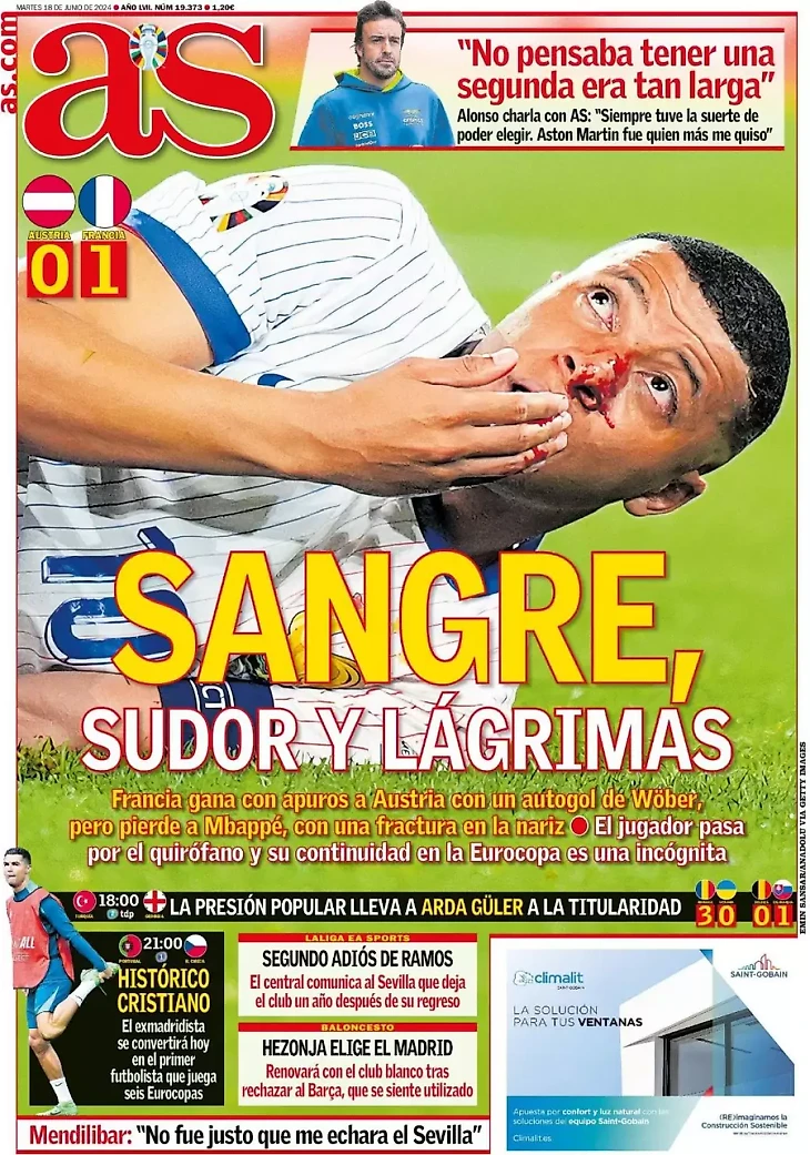 Испанцы уже переживают за своего Мбаппе. Обложек с ним больше – смотрите в телеграм-канале. А вот «Кровь, пот и слезы» – это речь Уинстона Черчилля, произнесенная им 13 мая 1940 года перед палатой общин, – первая в качестве премьер-министра после вступления Великобритании во Вторую мировую войну. Буквально его цитата звучит так: «Как я сказал тем, кто присоединился к этому правительству: «Мне нечего предложить, кроме крови, тяжелого труда, слез и пота».