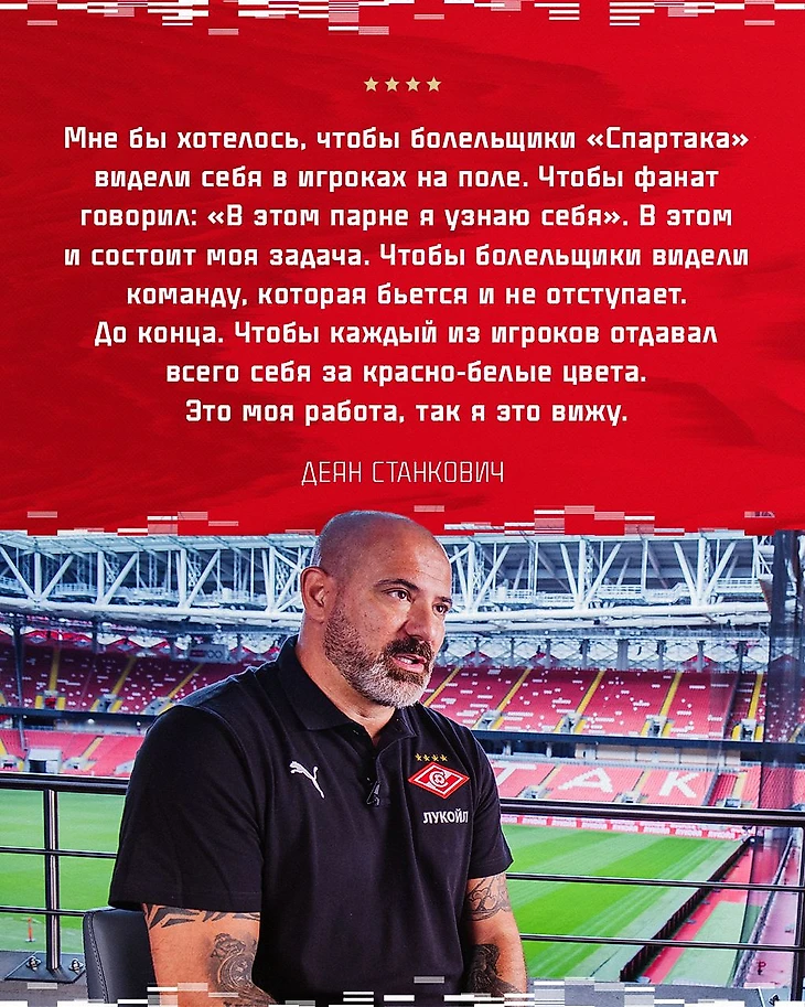 Любой тренер считает себя лучшим в мире, но лучшим является тот, кто находит общий язык с командой, который видит отправные точки, помогает становиться лучше каждому, кто может сплотить команду и никогда не сдается. Мне бы хотелось, чтобы болельщики «Спартака» видели себя в игроках на поле. Чтобы фанат говорил: «В этом парне я узнаю себя». В этом и состоит моя задача. Чтобы болельщики видели команду, которая бьется и не отступает. До конца. Чтобы они видели себя в игроках, каждый из которых отдает всего себя за эти цвета. Это моя работа, так я это вижу.