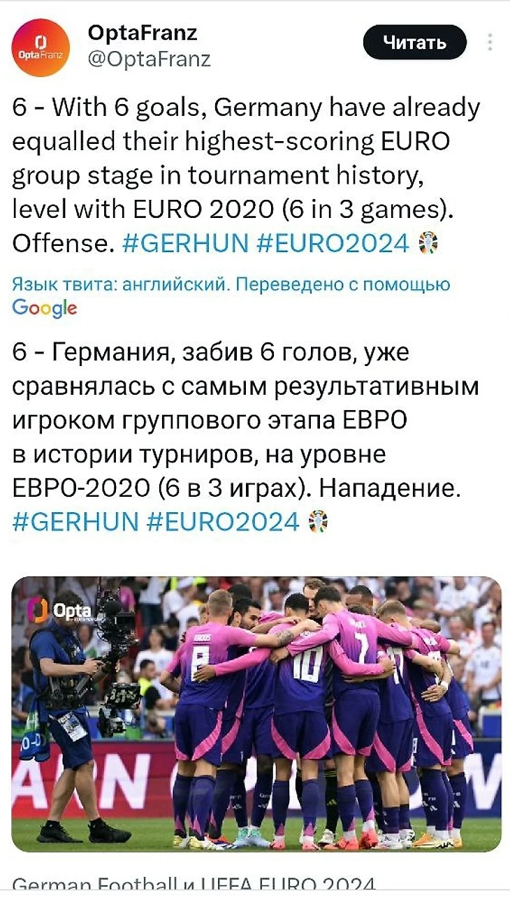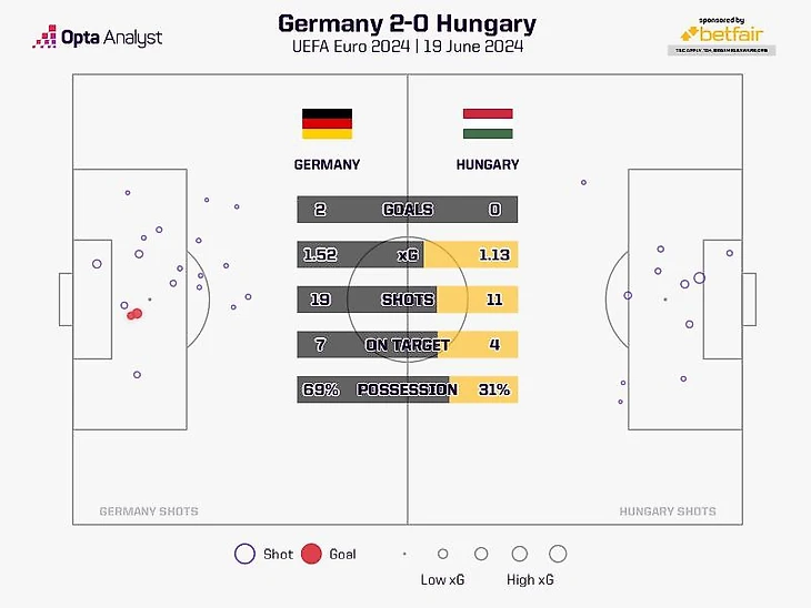 Сборная Германии стала первой командой, вышедшей в плей-офф чемпионата Европы. К тому же Бундестим обыграла на международных турнирах венгров впервые с ЧМ-1954. Победа на том мундиале стала дебютным важным трофеем для немецкой команды. Успешный старт и сейчас позволяет оптимистично смотреть на борьбу за титул на домашнем ЕВРО.