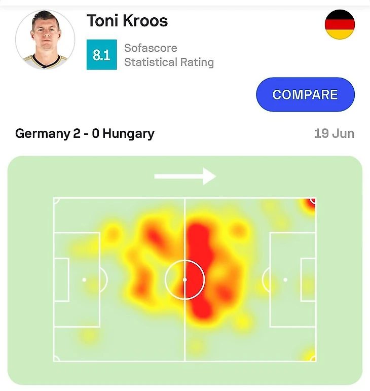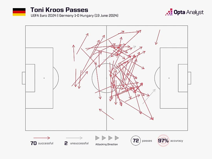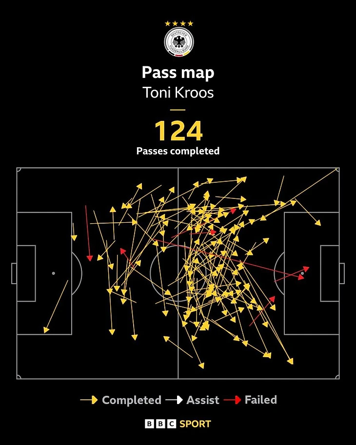 Тони Кроос выполнил 124 передач в матче. Это второй результат среди полузащитников на Евро, уступая лишь 127 успешным передачам Хави за сборную Испании против Ирландии на Евро-2012