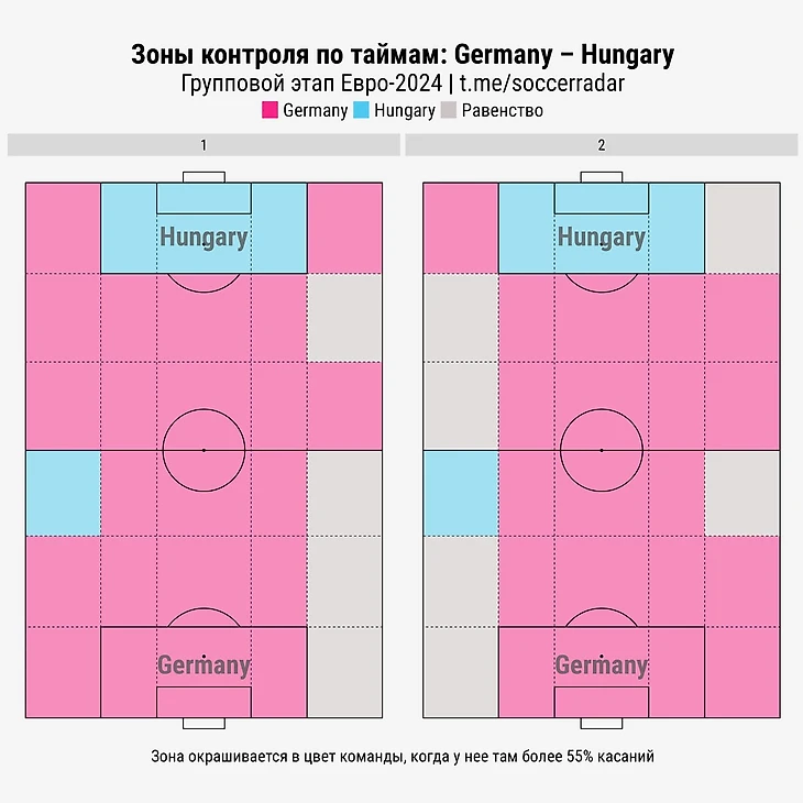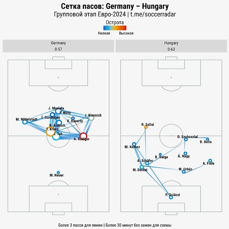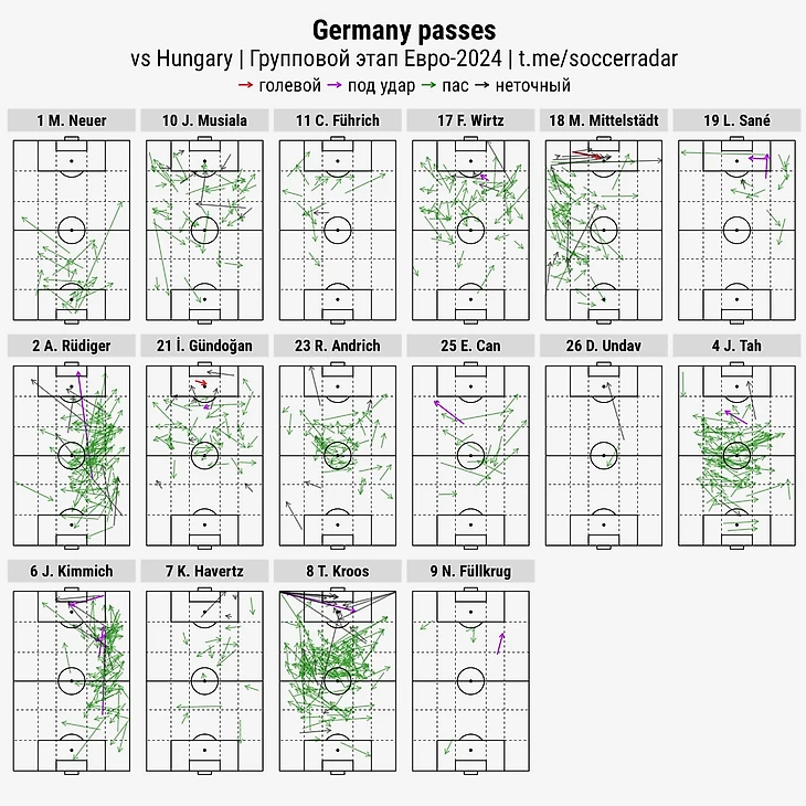 На старте второго тайма опасным ударом напомнил о себе Тони Кроос. Маэстро немецких атак ещё активнее дирижировал ими, чем в первом туре. В матче с Шотландией Тони отдал 101 точную передачу, против Венгрии — 124. Это второй результат в истории ЕВРО после Хави в 2012-м.