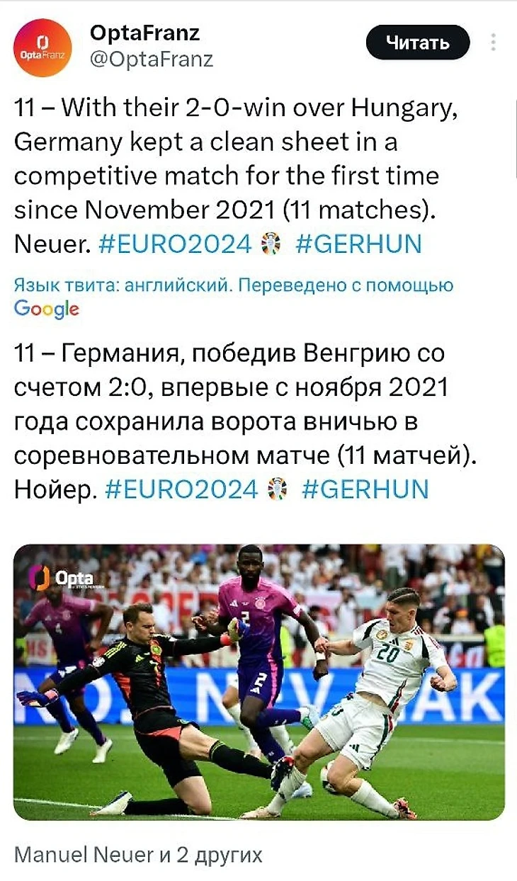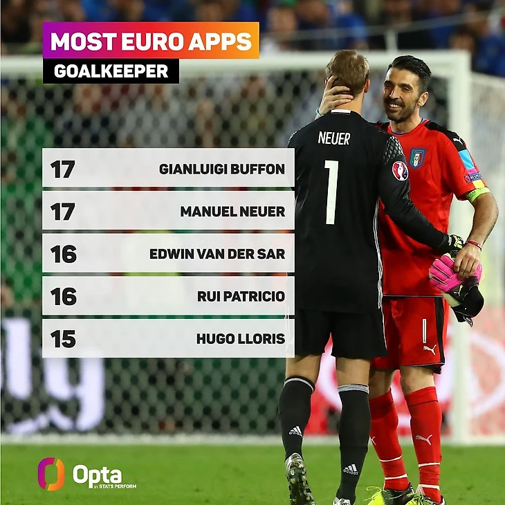 Это 17-й матч Мануэля Нойера на Евро, лучший результат среди вратарей в истории турнира