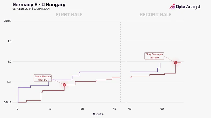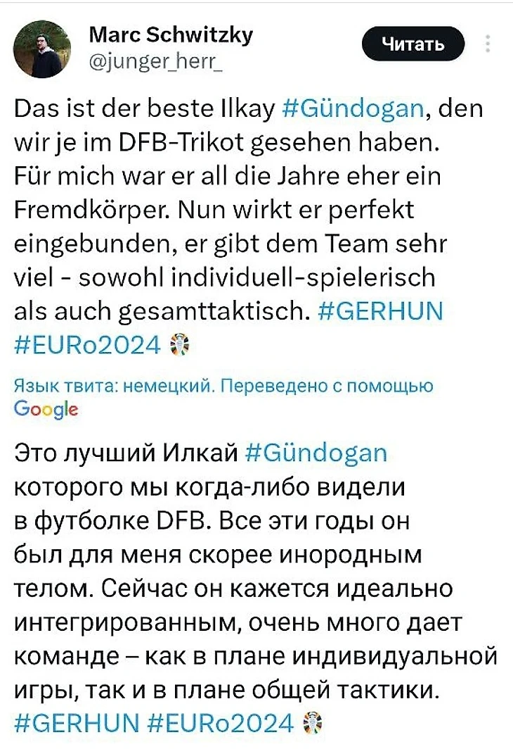 На экваторе первого тайма (не без небольшого скандала) Германия повела. Илкай Гюндоган поборолся с Гулачи и защитниками за мяч на углу вратарской, отобрал его при активной игре в корпус и отпасовал на Мусиалу. Тот не промахнулся, а видеоассистент арбитра вынес вердикт: засчитать гол. Символично, что Джамал родился в Штутгарте, не играл за местный клуб, но смог отличиться на ЕВРО в родном городе.