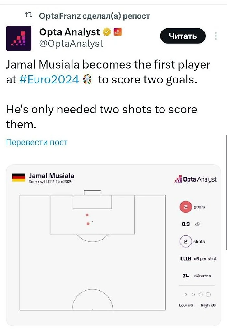 Джамал Мусиала стал первым игроком на Евро2024, который забил два гола.