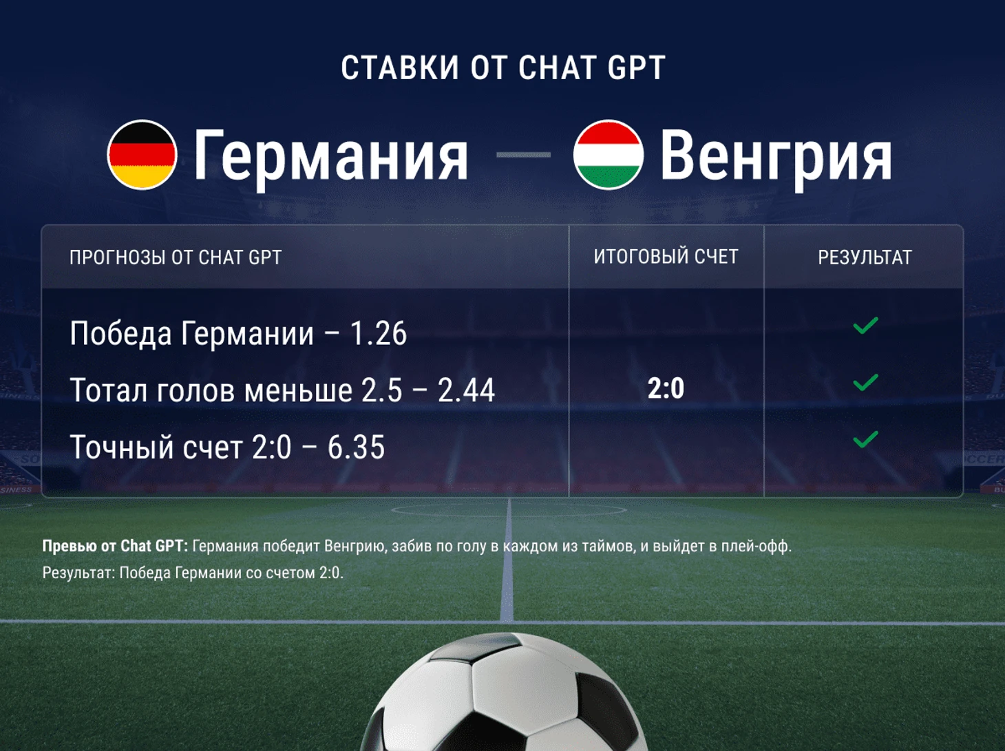 Евро-2024 в самом разгаре, уже стартовал 2-й тур группового этапа главного состязания года. Сборная Германии, один из фаворитов и страна-хозяйка турнира, оформила очередную победу, уверенно переиграв сборную Венгрии в Штутгарте. Результат поединка с точностью до мелочей предсказал наш эксперт Chat GPT.