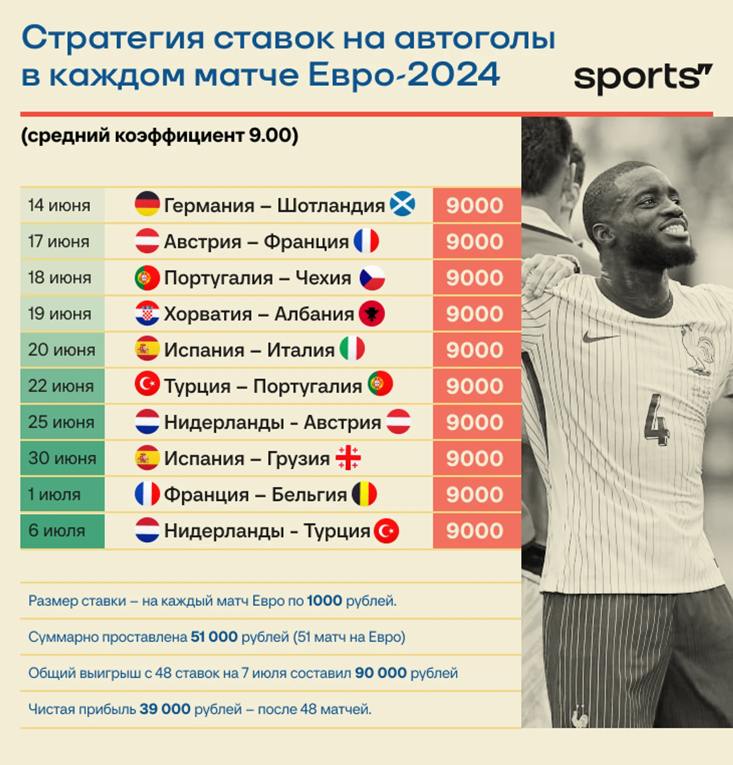 Используем самый простой вариант – ставка по 1000 рублей на каждый матч. В 48 матчах было десять автоголов, чистая прибыль – уже 39 тысяч рублей, даже если ни одного автогола на турнире больше не будет в оставшихся трех играх.