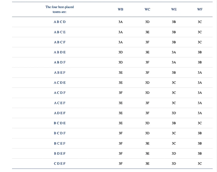 Представим, что это будут команды из групп A, B, C и D: тогда первая команда группы B сыграет с третьей командой группы A, 1С – с 3D, 1E – с 3B, а 1W – с 3C. В регламенте прописаны все возможные варианты: