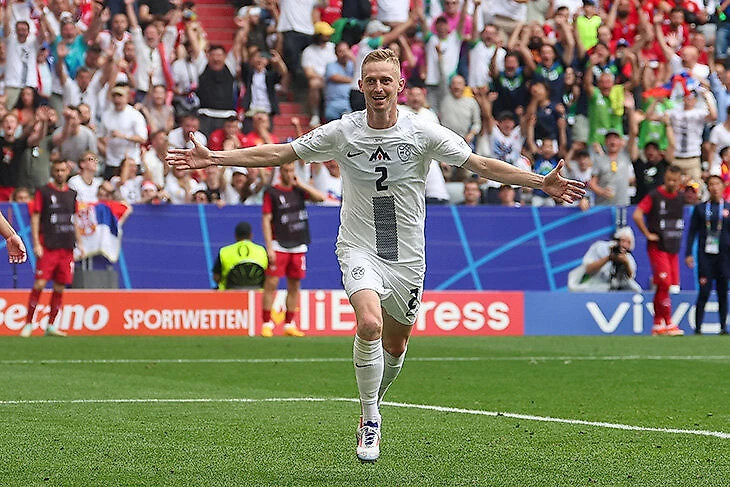 Крайние защитники – фундамент почти всех атак Словении на Евро (и пока единственные, кто в команде забивал). Такие Робертсон и Трент на минималках. В этом туре гол сделал Карничник: сначала разложил двоих ложными финтами и продвинул мяч, потом замкнул дальнюю, опозорив Милинковича-Савича.