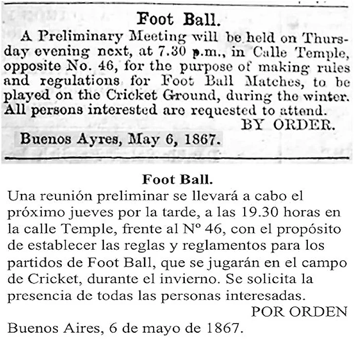 В 1867 году в редакцию газеты The Standard в Буэнос-Айресе были отправлены «Правила игры» Футбольной ассоциации, которые были приняты в декабре 1863 года после бурных дебатов и были призваны унифицировать игру и отличить ее от регби. Редактор, Эдвард Малхолл, передал книгу правил Томасу Хоггу, увлеченному игроку. Шестью годами ранее уроженец Дублина Малхолл и его брат основали англоязычную газету, чтобы удовлетворять потребности англоязычной общины, состоявшей в основном из английских, шотландских и ирландских иммигрантов. 6 мая в газете The Standard было напечатано следующее объявление: