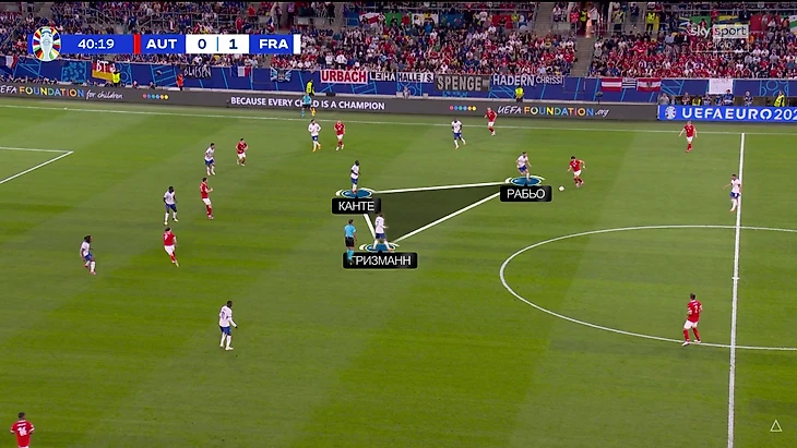 Схема Франции и раньше была не так уж далека от 4-3-3. Гризманн эпизодически играл восьмерку – особенно при обороне. Вот несколько примеров в матче против Австрии: Нголо Канте держит центр, а Антуан на одной линии с Адриеном Рабьо: