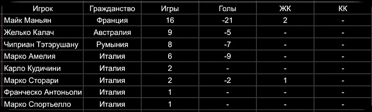 3.СЕБАСТЬЯНО РОССИ (ИТАЛИЯ) - 31 МАТЧ, ПРОПУЩЕННЫЕ ГОЛЫ - 22, 2 ЖК
