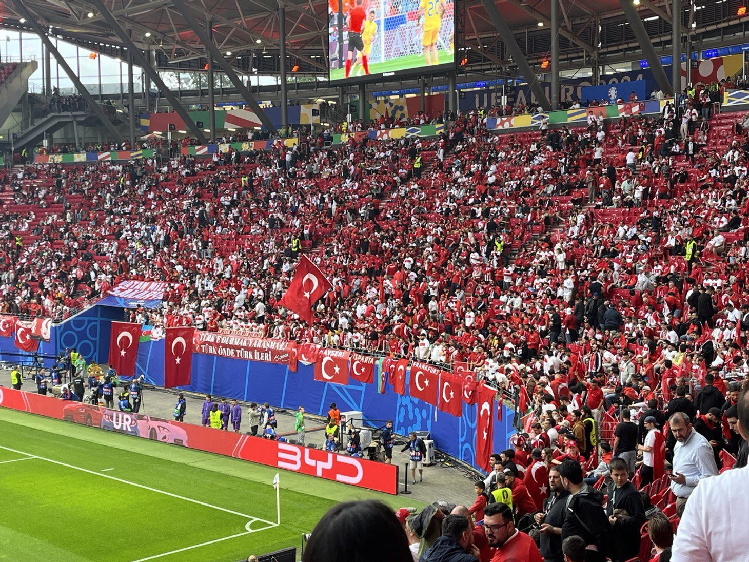 До начала матча почти час, турецких футболистов еще нет. Но на соседней трибуне уже готовы. Любопытная деталь: турецкий флаг с надписью «Франкфурт».
