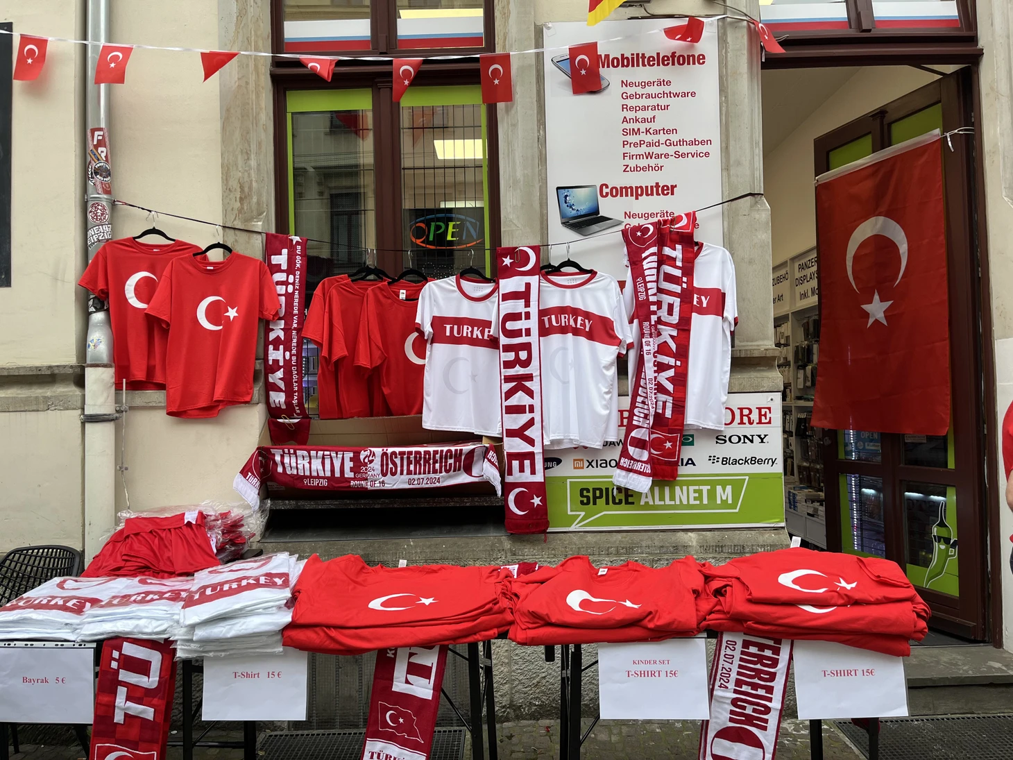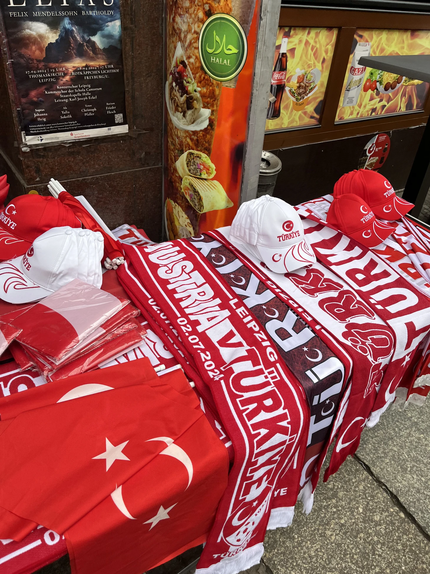 Чем ближе к стадиону, тем чаще встречаю развалы с турецкими футболками, шарфами и флагами. В не самых очевидных местах: например, около кебабной и салона мобильной связи.