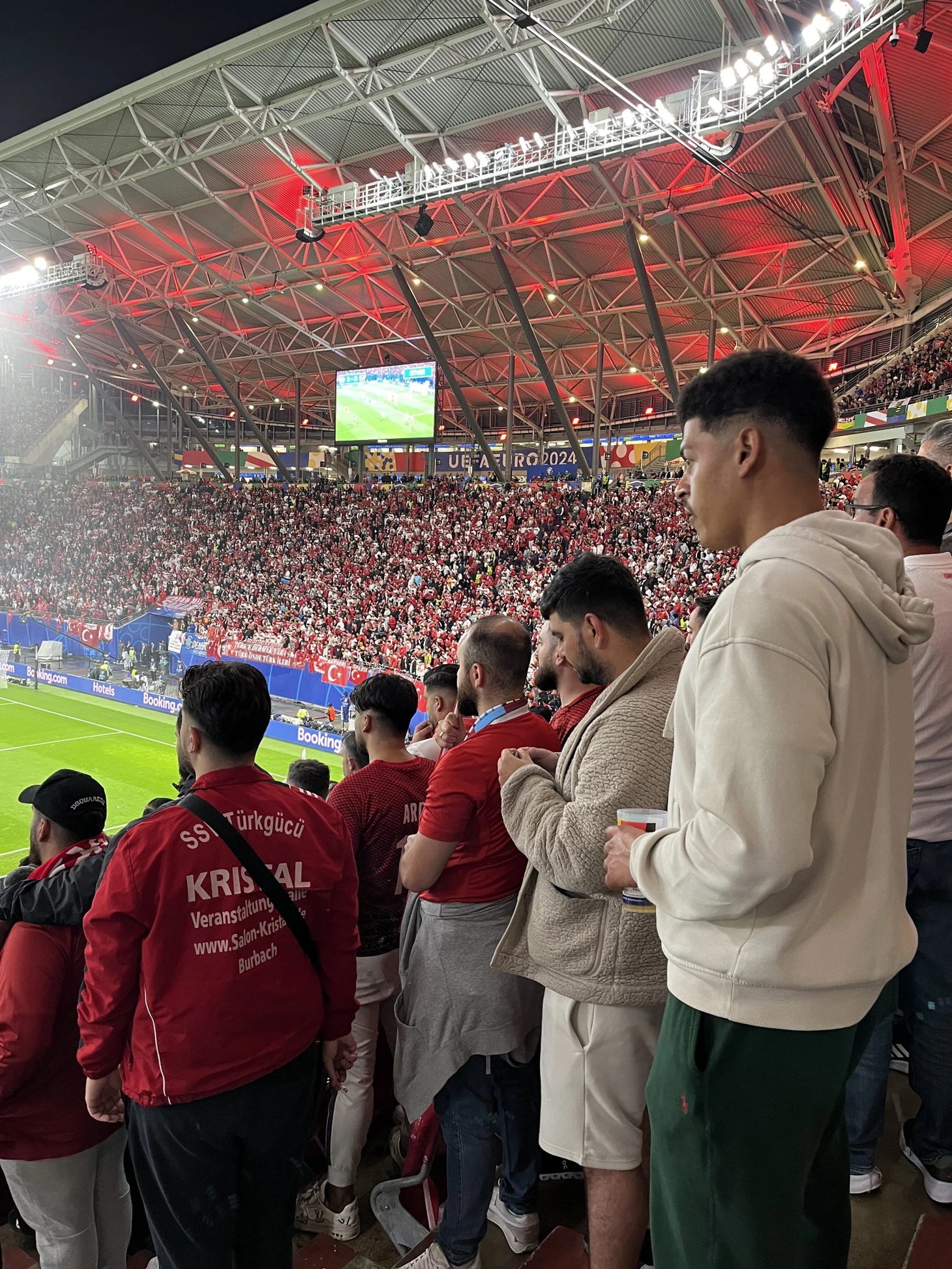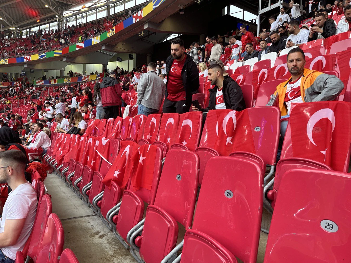 В чаше стадиона различить австрийских и турецких болельщиков сложно: все окрашено в красный. Арена условно делится на две половины: австрийцы занимают трибуну, ближе к которой в первом тайме играл Мерт Гюнок, противоположная – турецкая. У меня идеальная позиция, чтобы следить: в проходе от их трибуны.