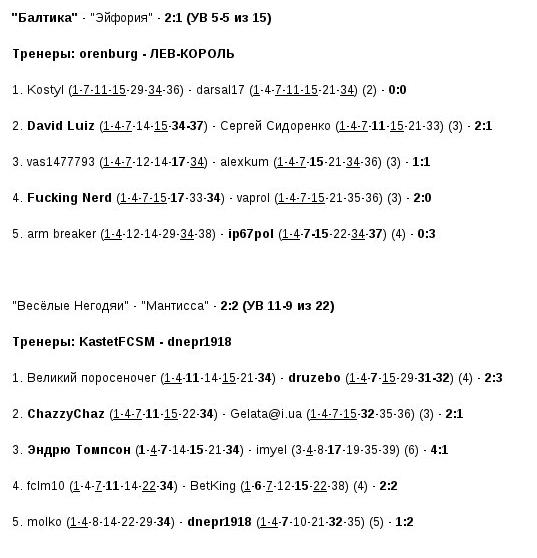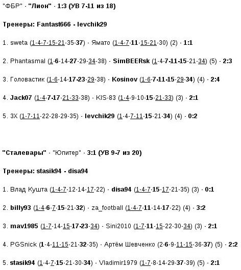 по 6 голов - Kostyl (Балтика), agglutinatethroat, Kosinov (оба - Лион), stasik94 (Сталевары)