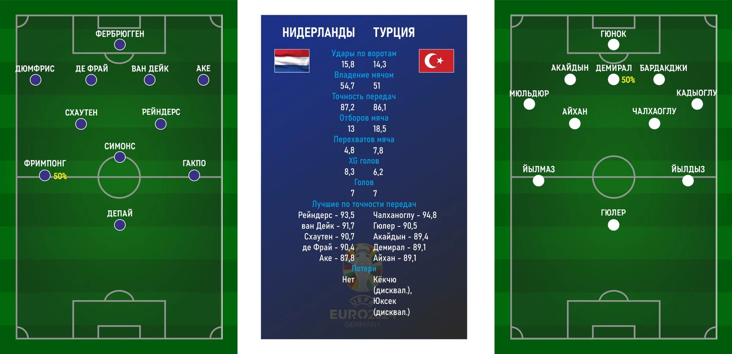 Наконец, наиболее вероятный сюрприз снова могут устроить турки. Голландцы, скорее всего, выйдут также, как в 1/8, но наверняка справа будет не Бергвайн. Напрашивается вариант с быстроходным и техничным Фримпонгом.