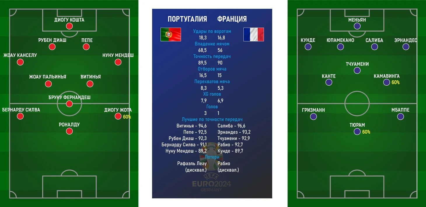 У обеих команд потери. Не сыграет Рафаэль Леау, но это потеря относительная. За весь турнир он никак себя не проявил кроме лени. Кто заменит - большой вопрос. Скорее, Жота, у которого богатый опыт и несомненный уровень, но есть шанс и у Консейсау. Однако очевидно, что молодой Консейсау будет лучше как игрок замены. Есть также вероятность, что Португалия сыграет в пять защитников, но это менее очевидно, принимая во внимание, что качество замены игроков обороны оставляет желать лучшего.