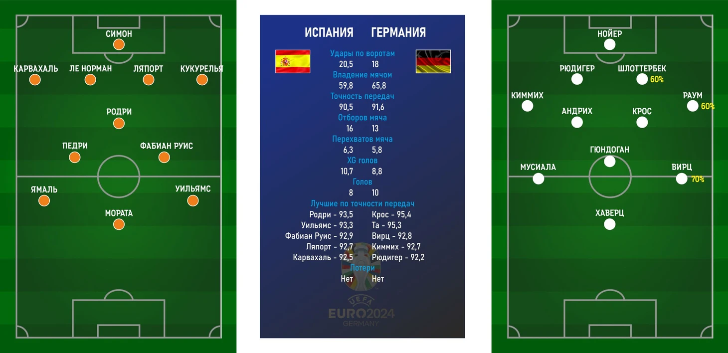 Состав Испании не предвещает никаких сюрпризов. Все позиции ожидаемы. У немцев есть, где угадывать. После того, как Шлоттербек и Раум убедительно провели 1/8 финала, их место становится более явным, чем у Та и Миттельштедта. Зане, сыгравшей в основе с Данией, пожалуй, должен вернуть место Вирцу - он явно не наиграл на нужный уровень.
