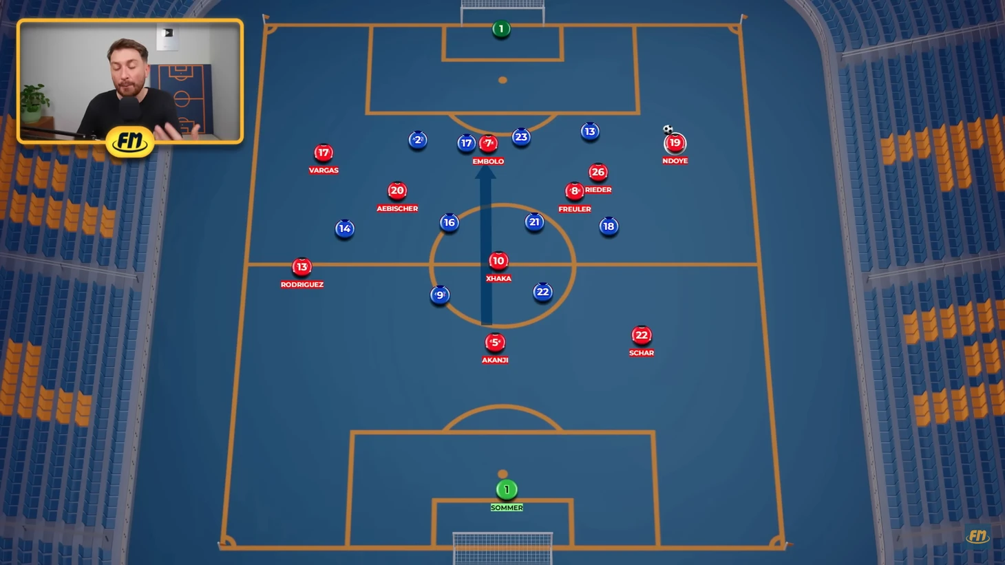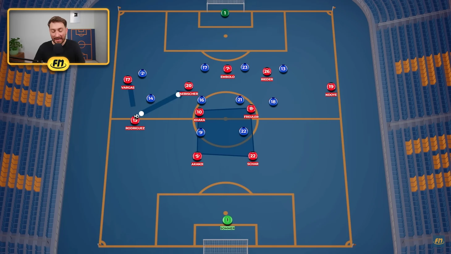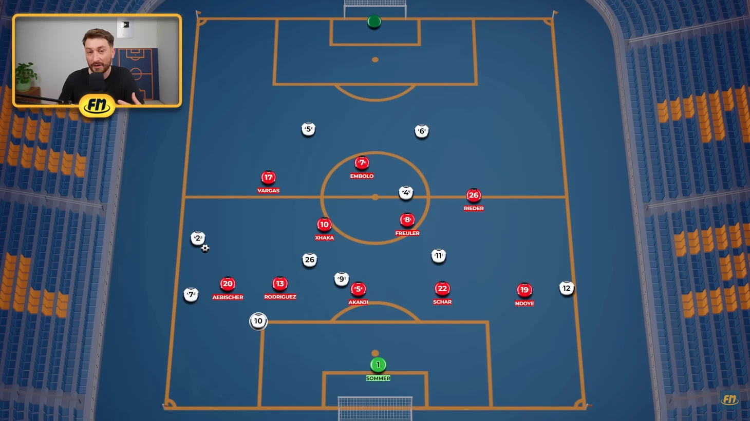 Если на правом фланге полузащиты Ндойе играет преимущественно по бровке, то слева можно увидеть, как Эбишер постоянно меняет свою позицию. В силу модельных характеристик как игрока, он не может играть в роли классического вингбэка по флангу. В клубе он выступает как опорный полузащитник - а эти роли в сборной заняли Джака и Фройлер.