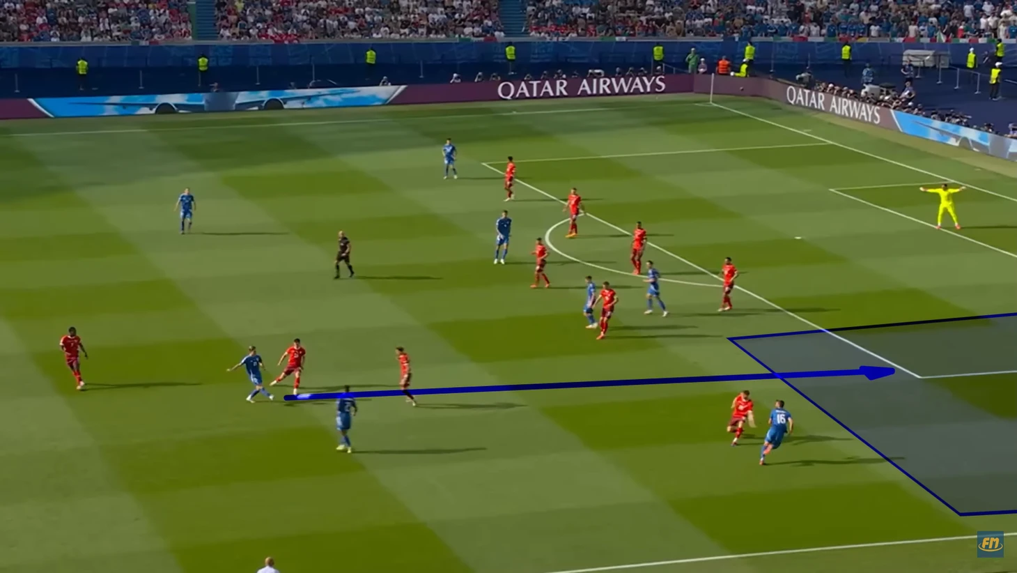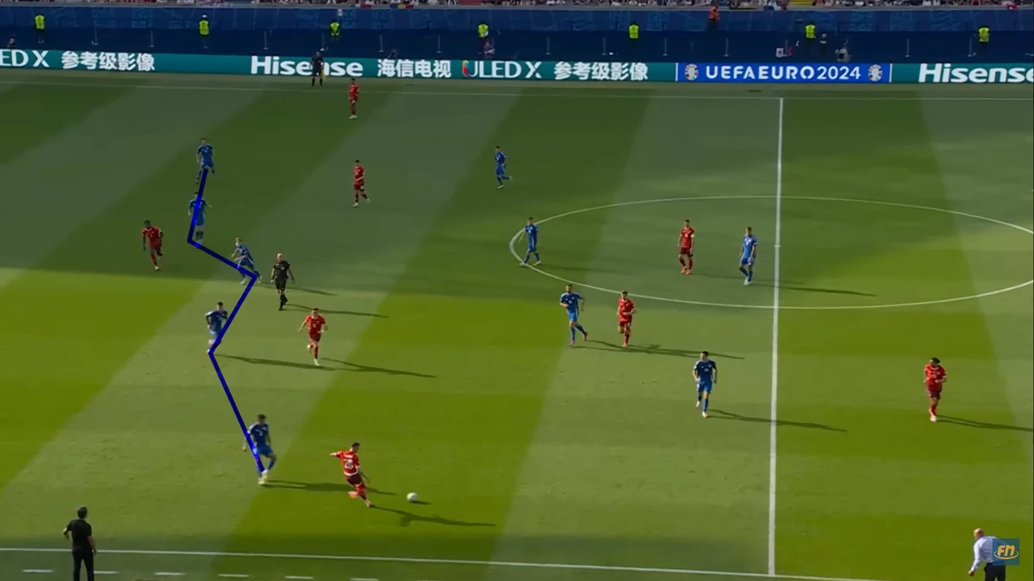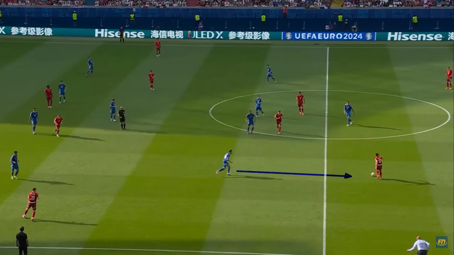 Следующий момент - уязвимость схемы сборной Швейцарии. 5-2-3 в обороне дает необходимый объем ширины при переводах соперника, но уязвима из-за отсутствия дополнительного игрока в зоне полузащиты (4v3 или 3v2 по эпизоду). Это предоставляет возможность проникающих передач за спину вингбекам - такие забегания совершает Сака, такие забегания проходили и у итальянцев, и у немцев.