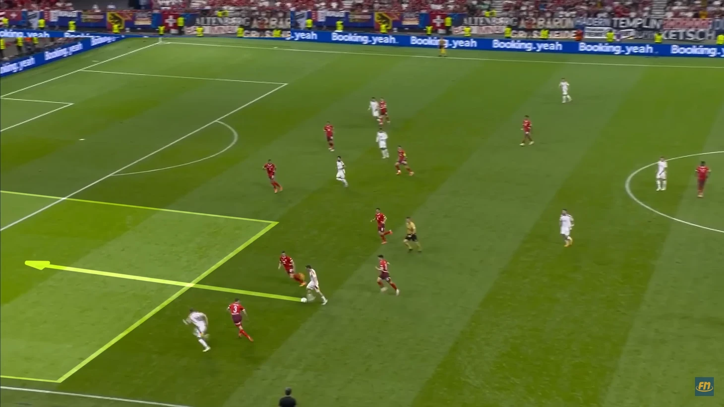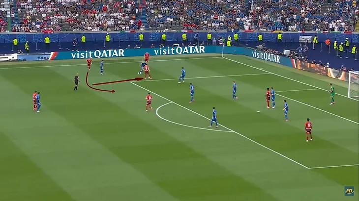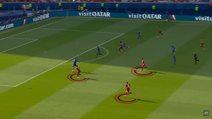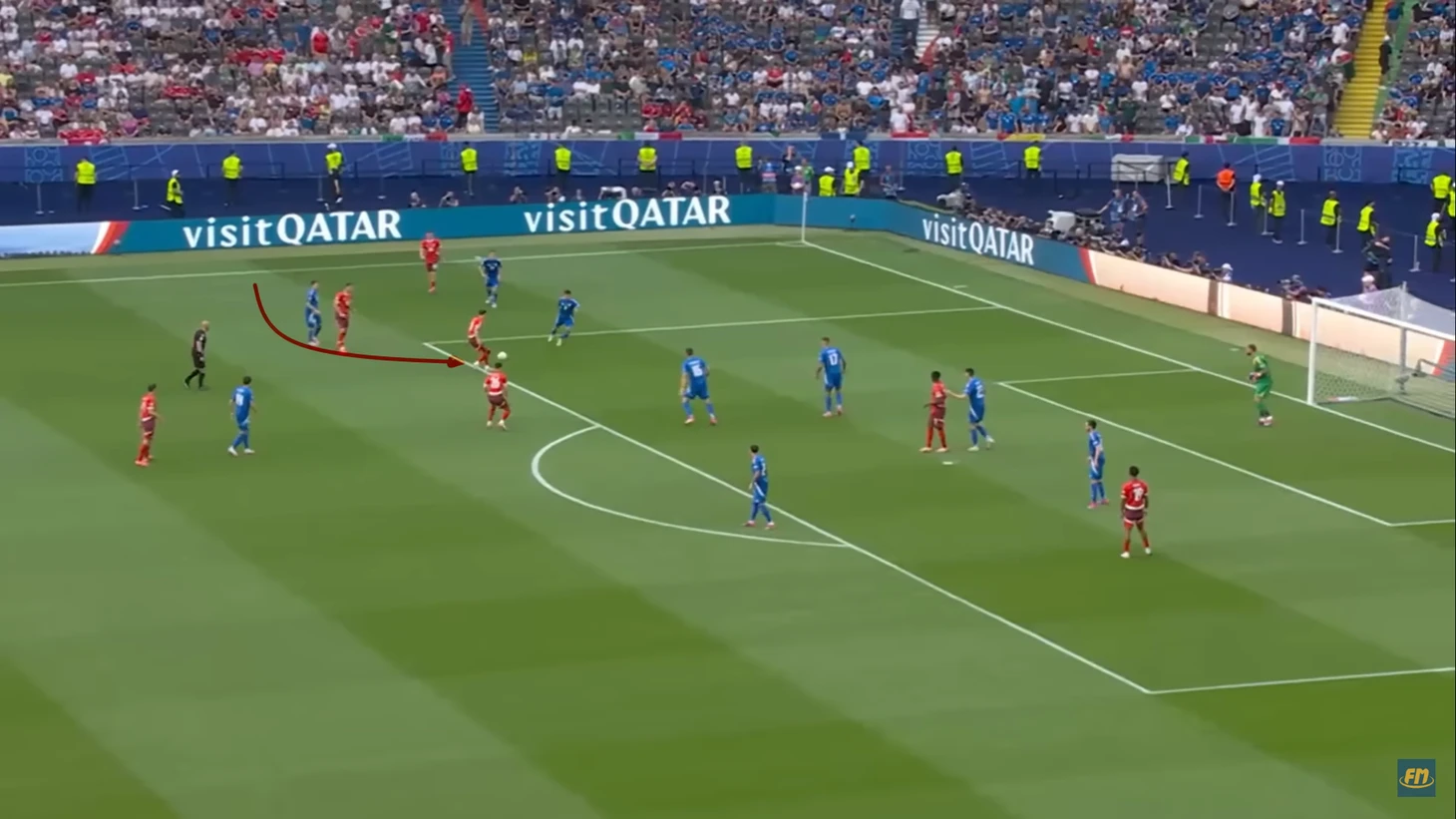 Следующий момент - уязвимость схемы сборной Швейцарии. 5-2-3 в обороне дает необходимый объем ширины при переводах соперника, но уязвима из-за отсутствия дополнительного игрока в зоне полузащиты (4v3 или 3v2 по эпизоду). Это предоставляет возможность проникающих передач за спину вингбекам - такие забегания совершает Сака, такие забегания проходили и у итальянцев, и у немцев.