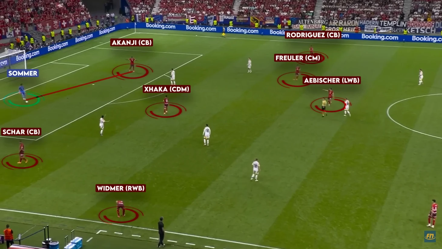 Против Италии, обороняющейся в 4-4-2, швейцарцы при билдапе действовали по-другому: перегружали линию защиты итальянцев 5-ю игроками, перестраивались на 2 центральных защитника и разыгрывали через квадрат.