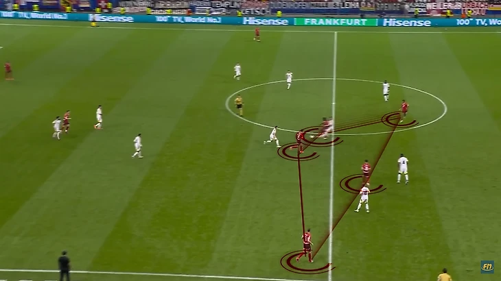 Атакующая тройка при этом располагается узко, но поддерживается правым вингбэком - в этом случае это Видмер, и нацеленным на вторые мячи Фройлером.
