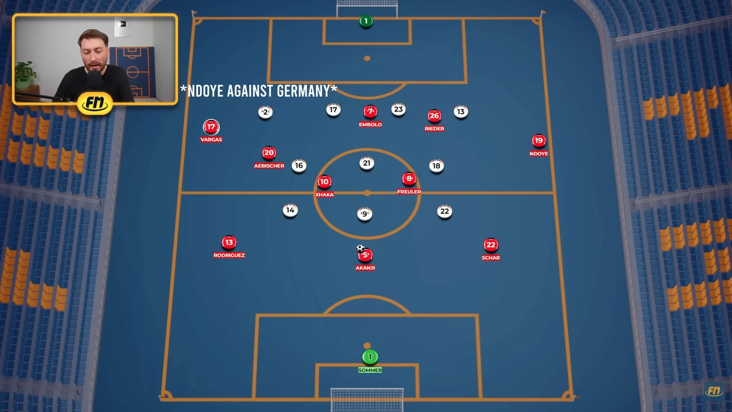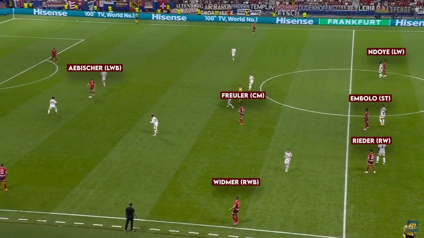 Так, против Германии, обороняющейся в схеме 4-3-3 швейцарцы сохраняли структуру с тремя центральными защитниками - на помощь им при розыгрыше приходили Джака и Фройлер, Эбишер наполнял центральную зону, а ширину слева поддерживал Ндойе.