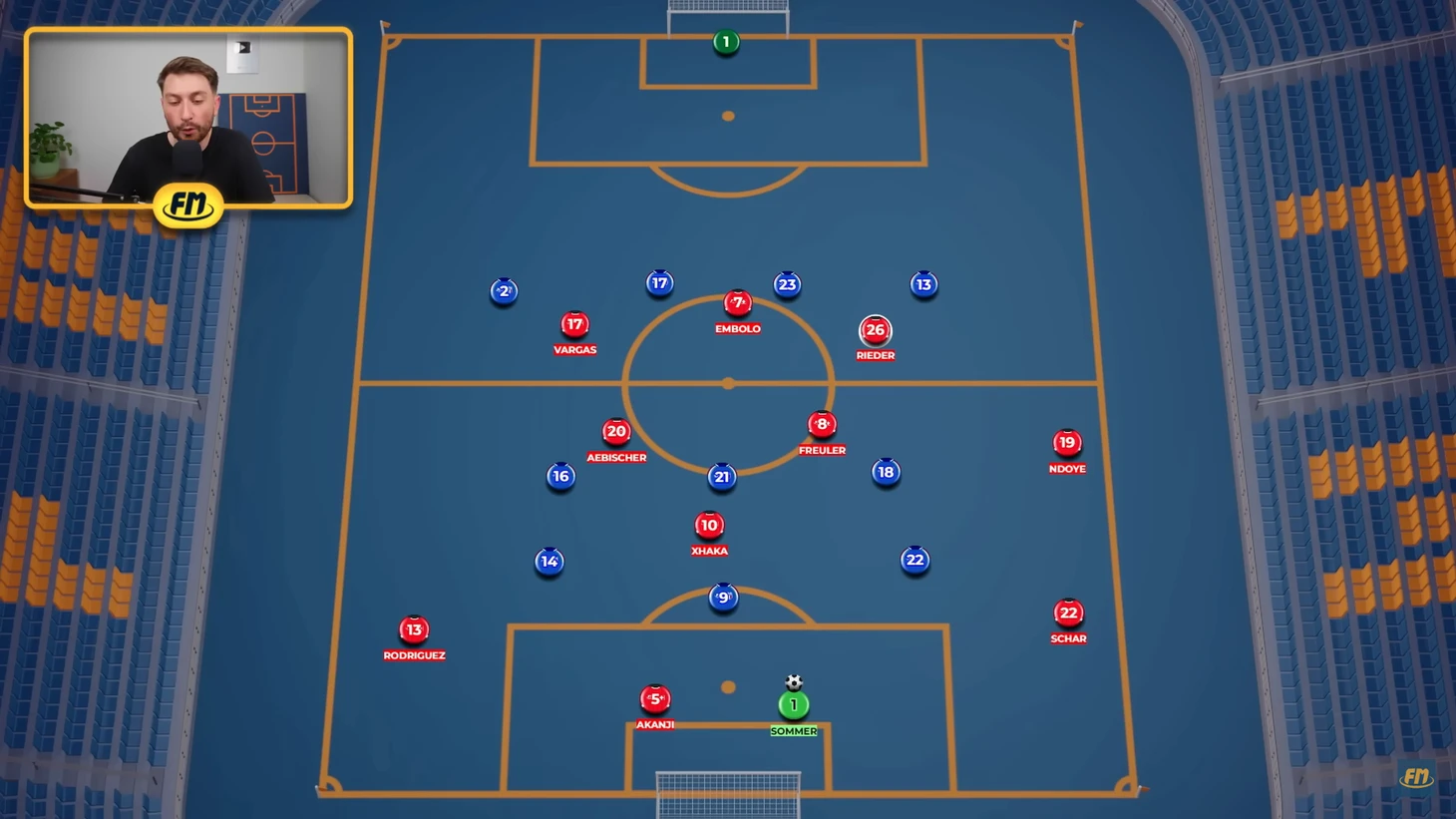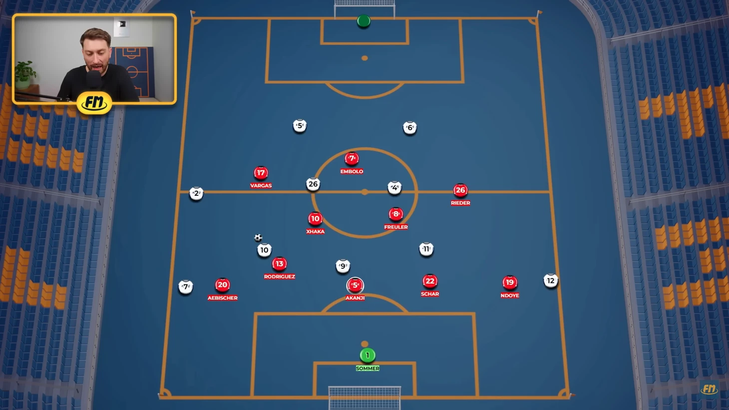 С самого начала фазы построения атаки швейцарцы совершают много ротаций, тем самым создавая необходимую глубину поля и используя свободные зоны. Так, при розыгрыше в пару к Аканджи поднимается Зоммер - формируется линия из 4-х защитников, Шер и Родригес уходят шире во фланги.