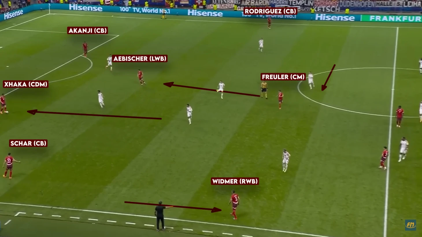 При этом швейцарцы не ограничиваются таким расположением в развитии атаки. Ситуативно Джака оказывается в роли правого центрального защитника, Эбишер «падает» в позицию опорного, а Фройлер остается между линиями.