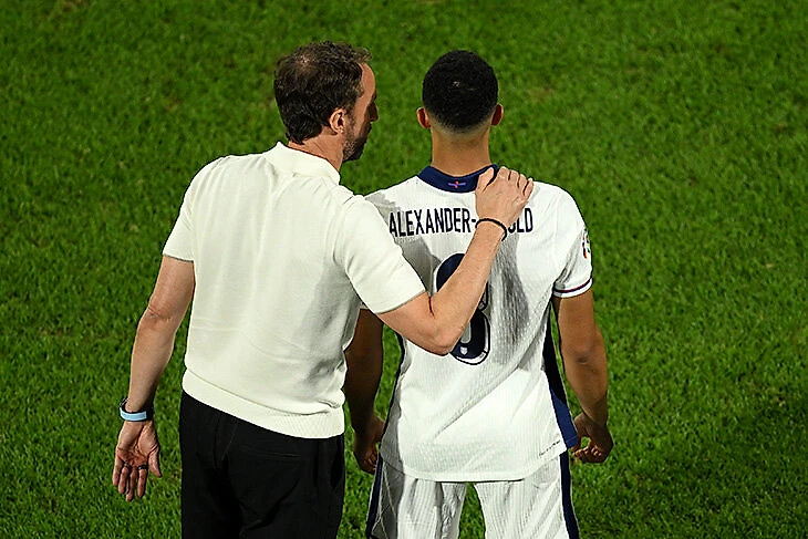 На 114-й Пикфорд снова тянет время под свист швейцарской трибуны, а Саутгейт готовит замену – Трент вместо Фодена. Кажется, не было даже установки: перед выходом Гарет просто ободряюще хлопнул игрока «Ливерпуля» по спине.