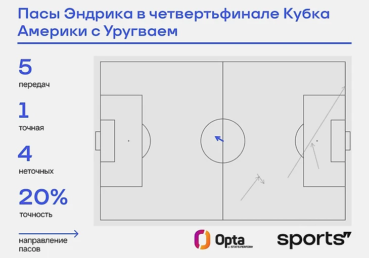 Всего у Эндрика пять пасов – единственный точный был назад. На чужой половине бразилец запорол все четыре – и так очень мало, а тут еще и нулевая точность. Зато на 84-й минуте Эндрик пробил в створ – низом и не очень опасно. Больше заметных действий от бразильской «девятки» не было.