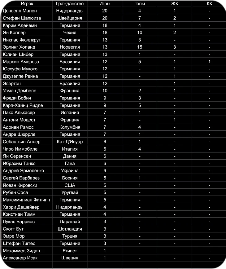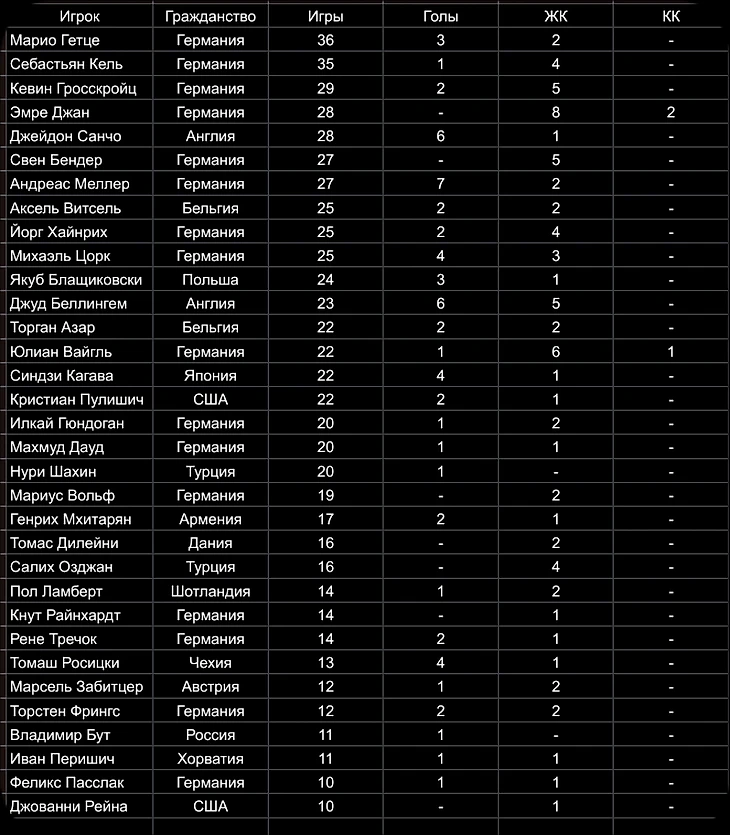 1.МАРКО РОЙС (ГЕРМАНИЯ) - 72 МАТЧА, ЗАБИТЫЕ ГОЛЫ - 25, 6 ЖК