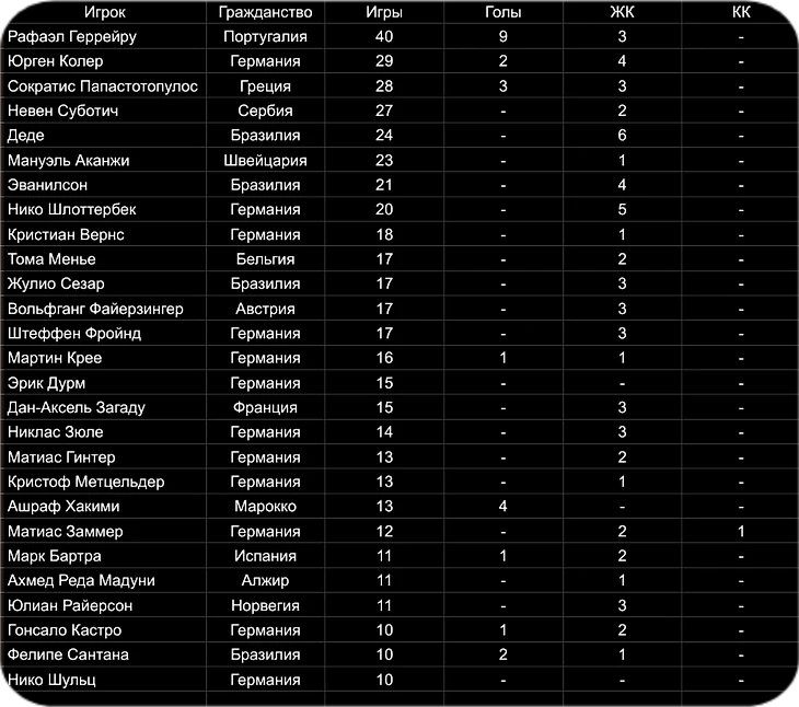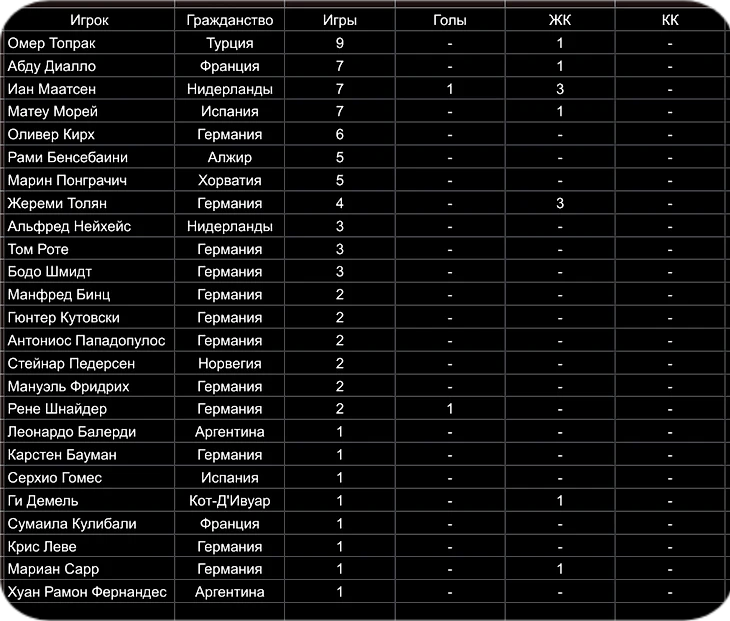 1.МАТС ХУММЕЛЬС (ГЕРМАНИЯ) - 66 МАТЧЕЙ, ЗАБИТЫЕ ГОЛЫ - 3, 12 ЖК, 1 КК