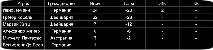1.РОМАН ВАЙДЕНФЕЛЛЕР (ГЕРМАНИЯ) - 38 МАТЧЕЙ, ПРОПУЩЕННЫЕ ГОЛЫ - 52, 1 ЖК, 1 КК