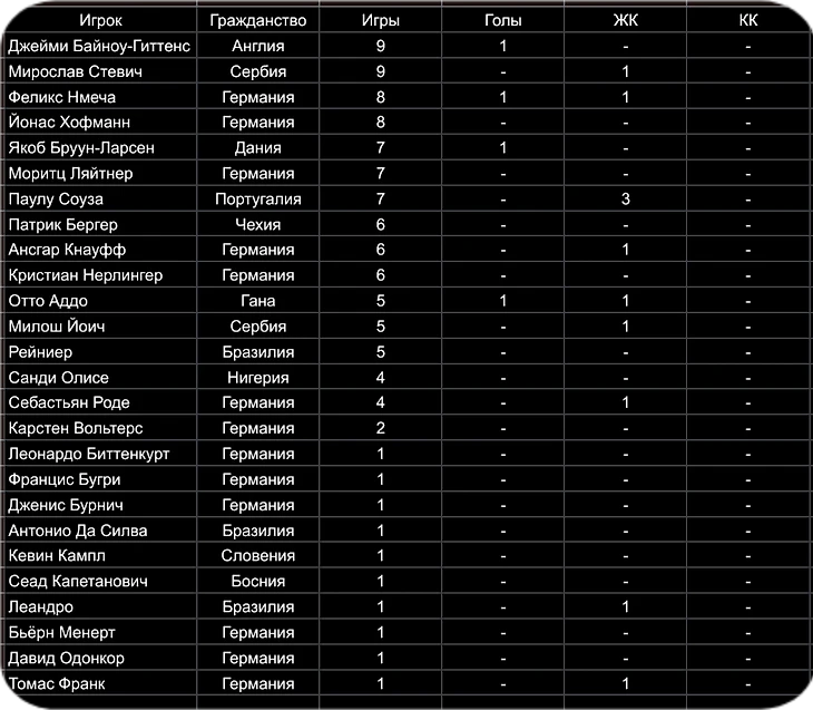 2.ЛАРС РИККЕН (ГЕРМАНИЯ) - 43 МАТЧА, ЗАБИТЫЕ ГОЛЫ - 7, 6 ЖК, 1 КК