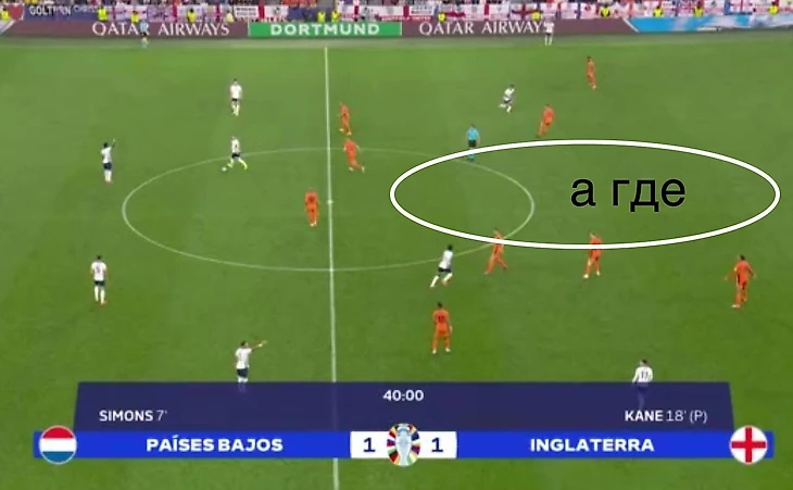 Но из настолько ужасной оборонительной игры Нидерландов можно было выжать еще больше! Вернитесь к скриншоту с дырой Нидерландов в центре защиты при выдвижении Де Врея. Почему никто из англичан не вбегает в эту зону? Зачем нужны эти бесконечные спуски Харри Кейна чуть ли не в свою опорную, если в такой ситуации никто не выбегает на острие?