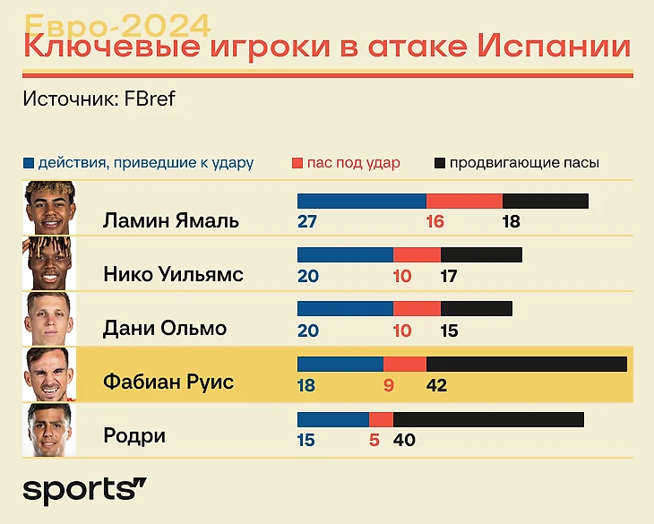 Взаимодействие с Родри – один из ключевых элементов игры Руиса. Но польза от Фабиана на этом не заканчивается. Хавбек – ключевой игрок атаки сборной: создает не так много моментов, как Нико Уильямс или Ламин Ямаль, но важен на каждой стадии.