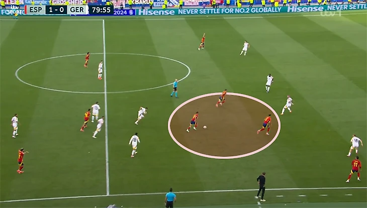 Пример – скорее комплимент в адрес Родри. Но видна одна из сильных сторон Фабиана – мастерски находит пространство. Это отмечал Кике Сетьен в «Бетисе», за счет этого аспекта Руиса однажды привлек внимание тренерского дуэта Анчелотти. На Евро поиск пространства стал ключевым преимуществом – почти все играют закрыто, приходится взламывать.
