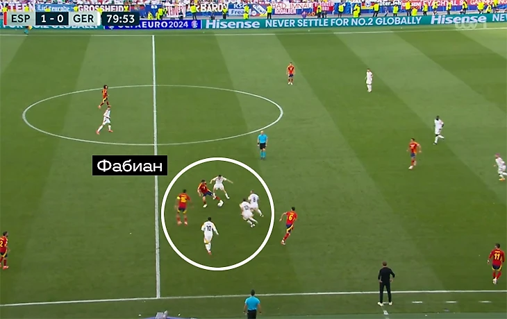 Фабиан занял в сборной место травмированного Гави. Возможно, он справляется даже лучше. Руис в зависимости от нужд испанцев выполняет три разные функции: первая – продвижение мяча рядом с Родри. Вторая – перегруз опорной зоны с Педри или Ольмо. Третья – опасные рывки в штрафную.
