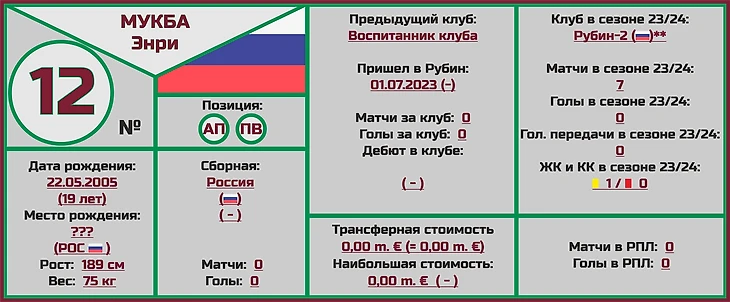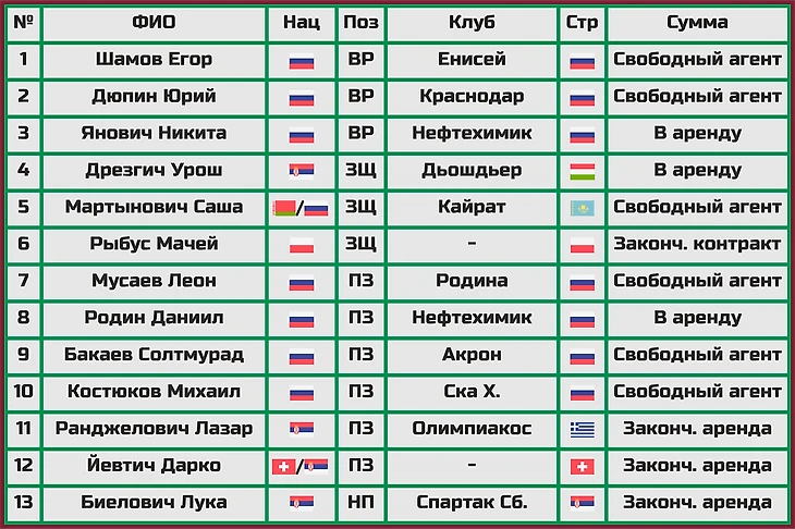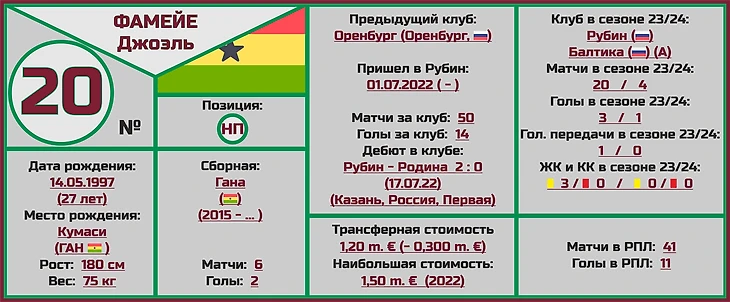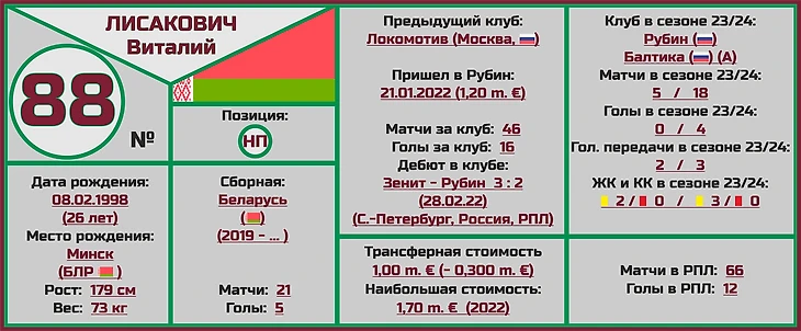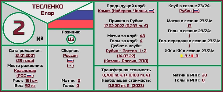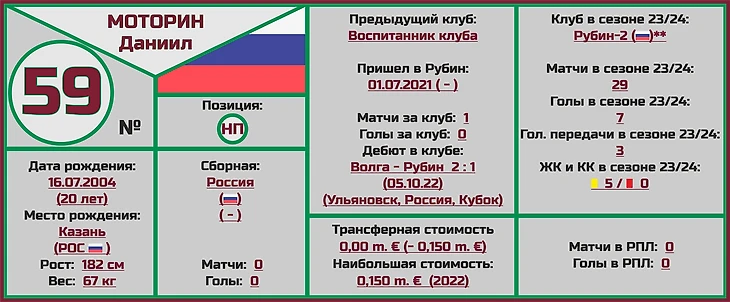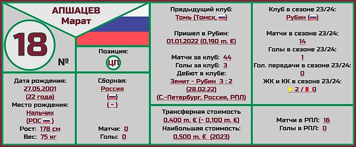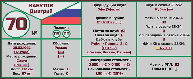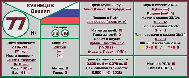 Все трансферные суммы переходов и оценки стоимости игроков и клубов взяты с сайта www.transfermarkt.world, вся информация по поводу правильного написания ФИО даты и места рождения, веса и роста футболистов по большей части с официальных сайтов клубов РПЛ.
