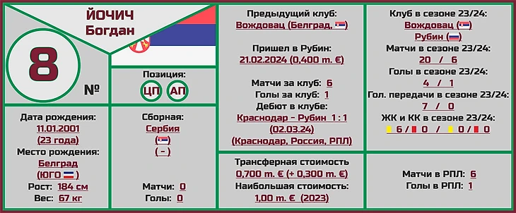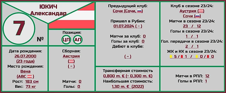 Особенно хочется отметить подписания австрийца Юкича, перешедшего в клуб из вылетевшего по итогам прошлого сезона «Сочи», играй он сначала, еще далеко не факт что сочинцы бы вылетели, да и на сборах «Рубина» перед стартом нового сезона он показывал отличную игру (забил 2 гола).